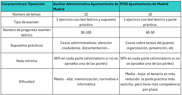 Si realizamos una comparativa entre los exámenes de Auxiliar Administrativo Ayuntamiento de Madrid y POSI Ayuntamiento de Madrid vemos las siguientes diferencias y similitudes: